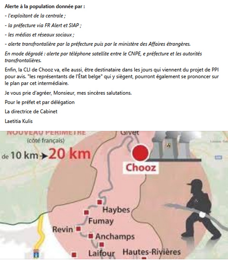 Le p'tit truc à savoir en plus ! La mise en place du PPI à Chooz est consécutif à un éventuel incident nucléaire : le risque zéro n'existe pas ! La gestion du plan est sous la responsabilité de la préfecture. Mais savez-vous que dans les communes concernées par le PPI et autre situation de crise, un PCS : Plan Communal de Sauvegarde est un document obligatoire qui constitue un relais entre les politiques locales de prévention des risques et celles de gestion des situations de crise. Ami(e)s vigilants et vigilantes, de part et d'autre de la frontière, renseignez vous auprès de vos élu(e)s afin de savoir si ce document existe et si il est actualisé. A bientôt ! |